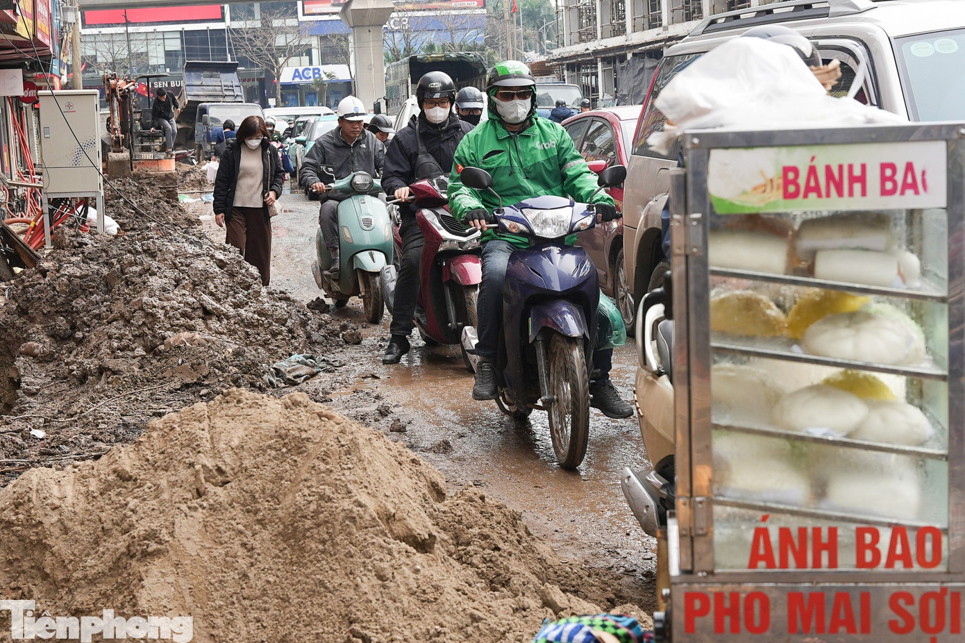 Sau cơn mưa phùn, mặt đường vốn đã gồ ghề vì bị đào xới nay càng trở nên lầy lội. Bùn đất nhão nhoét quyện với nước đọng tạo thành những cái bẫy trơn trượt, khiến việc di chuyển của người dân vô cùng gian nan, đặc biệt là trong giờ cao điểm .